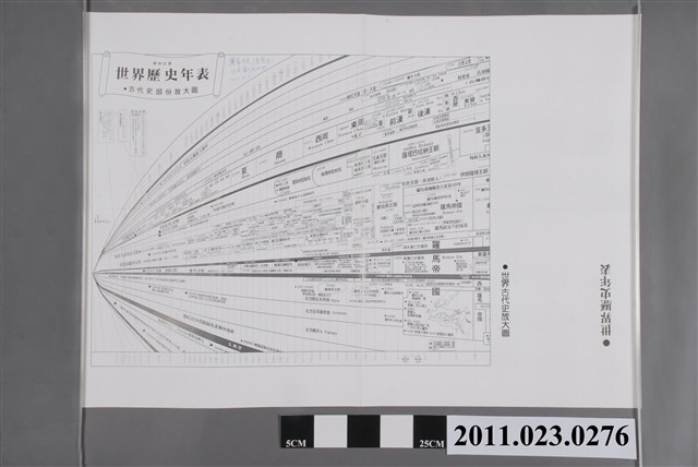蘇新田(SU HSIN-TIEN)著〈世界歷史年表〉(Chronological Chart of World History),全開單張雙面,黑白印刷,1999年4月初版,定價新台幣200元,著作人及發行人皆為蘇新田。正面為〈世界歷史年表〉,背面為〈世界歷史年表:古代史部分放大圖〉。