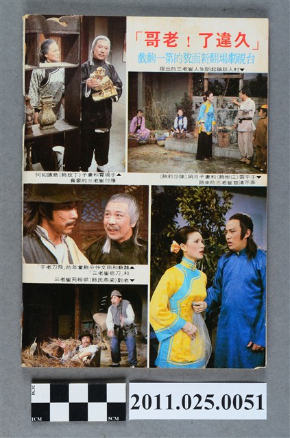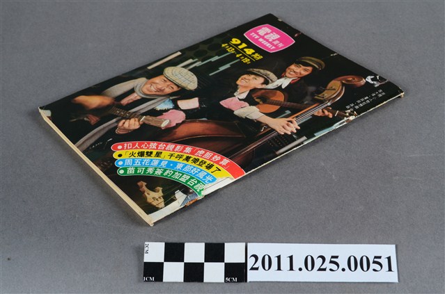 1.本物件為電視周刊TTV WEEKLY第914期,封面照片為明星陶大偉、夏玲玲、孫越。由物件正面可見「電視周刊TTV WEEKLY 第914期」、「4月13日-4月19日」字樣。其目錄章節可見包括「彩色之頁」(如:台視 小人物 的蝴蝶夫人狂想曲)、「專題報導」(如:苗可秀加盟台視)、「節目特寫」(如:台視閃電推出嶄新風格晚間國語連續劇集 盲女神龍)、「專欄」(如:封面人物 樹立典範的三位小人物)。該周刊內頁亦可見刊物發行人為劉侃如,發行所為台視文化事業公司,地址為臺北市八德路三段二號)。