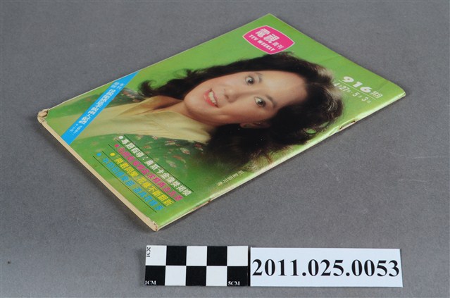 1.本物件為電視周刊TTV WEEKLY第916期,封面照片為明星苗可秀。由物件正面可見「電視周刊TTV WEEKLY 第916期」、「4月27日-5月3日」字樣。其目錄章節可見包括「彩色之頁」(如:台視閩南語劇集 嘉慶君遊台灣)、「專題報導」(如:五十二屆奧斯卡金像獎揭曉了)、「節目特寫」(如:盲女神龍 受到熱烈喝采)、「專欄」(如:封面人物 苗可秀演盲女成績斐然)。該周刊內頁亦可見刊物發行人為劉侃如,發行所為台視文化事業公司,地址為臺北市八德路三段二號)。