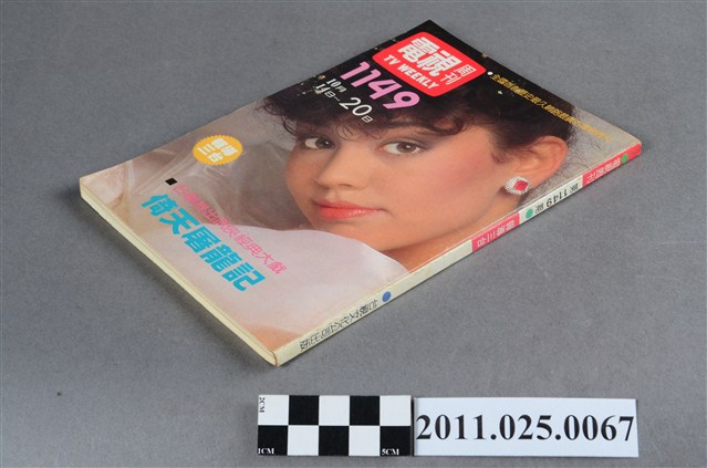 1.本物件為電視周刊TTV WEEKLY第1149期,封面照片為明星白雪。由物件正面可見「電視周刊TTV WEEKLY 第1149期」、「10月14日-10月20日」字樣。其目錄章節可見包括「特別報導」(如:漢聲綜藝訪問團赴美宣慰僑胞)、「電視論壇」(如:研究發展 邁向新局)、「三台節目焦點」(如:台視推出武俠經典大戲 倚天屠龍記)、「綜合專欄」(如:看電視談電視 請布袋戲演出孝悌故事)、「人物專訪」(如:中視添加生力軍)、「彩色之頁」(如:明星周曆 楊黎蘇)。該周刊內頁亦可見刊物發行所為台視文化事業公司,地址為臺北市八德路三段二號)。