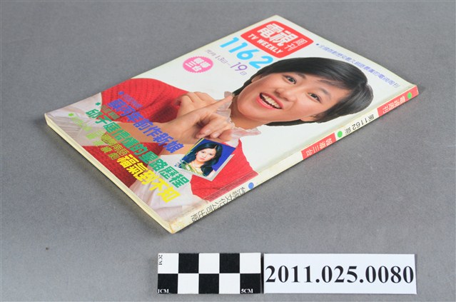 1.本物件為電視周刊TTV WEEKLY第1162期,封面照片為明星李玲娟。由物件正面可見「電視周刊TTV WEEKLY 第1162期」、「元月13日-元月19日」字樣。其目錄章節可見包括「特別報導」(如:掃黑義演盛況空前)、「電視論壇」(如:要提高生產力 先提升企業力)、「三台節目焦點」(如:台視 人之初 刻劃有情世界)、「綜合專欄」(如:看電視談電視 請報導美語教室的內容)、「人物特寫」(如:李玲娟台上台下人緣佳)、「彩色之頁」(如:明星周曆 鄭少秋乘風而來)。該周刊內頁亦可見刊物發行所為台視文化事業公司,地址為臺北市八德路三段二號)。