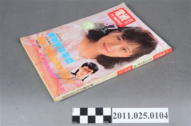 1.本物件為電視周刊TTV WEEKLY第1187期,封面照片為明星沈春華。由物件正面可見「電視周刊TTV WEEKLY 第1187期」、「7月7日-7月13日」字樣。其目錄章節可見包括「特別報導」(如:三台新聞部的新面孔)、「電視論壇」(如:連續劇該不該限制集數)、「三台節目焦點」(如:三台五間增播時段節目異動)、「綜合專欄」(如:看電視談電視 節目廣告化趨嚴重)、「人物特寫」(如:誰來了解叛逆的李亞明)、「彩色之頁」(如:電視周刊周曆)。該周刊內頁亦可見刊物發行所為台視文化事業公司,地址為臺北市八德路三段二號)。