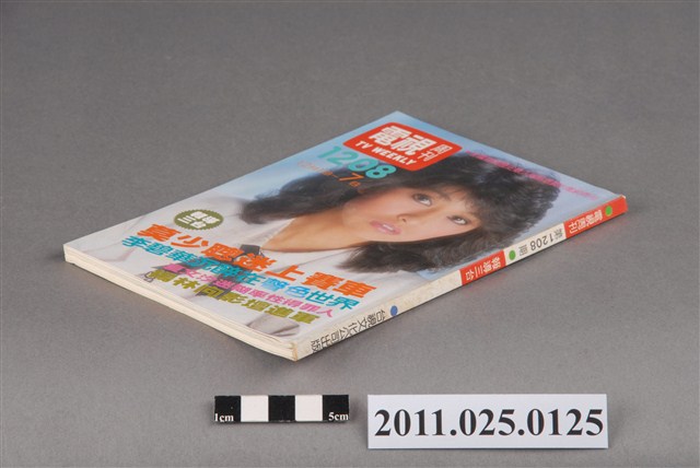 1.本物件為電視周刊TTV WEEKLY第1208期,封面照片為明星楊林。由物件正面可見「電視周刊TTV WEEKLY 第1208期」、「12月1日-12月7日」字樣。其目錄章節可見包括「特別報導」(如:莫少聰迷上賽車)、「電視論壇」(如:讓公視更上層樓的正確道路)、「三台節目焦點」(如:火鳳凰莫少聰挑戰潘迎紫)、「綜合專欄」(如:看電視談電視 我看台製武俠劇)、「人物特寫」(如:李碧華沉醉在聲色世界裡)、「彩色之頁」(如:施思演俠女令人癡迷)。該周刊內頁亦可見刊物發行所為台視文化事業公司,地址為臺北市八德路三段二號)。