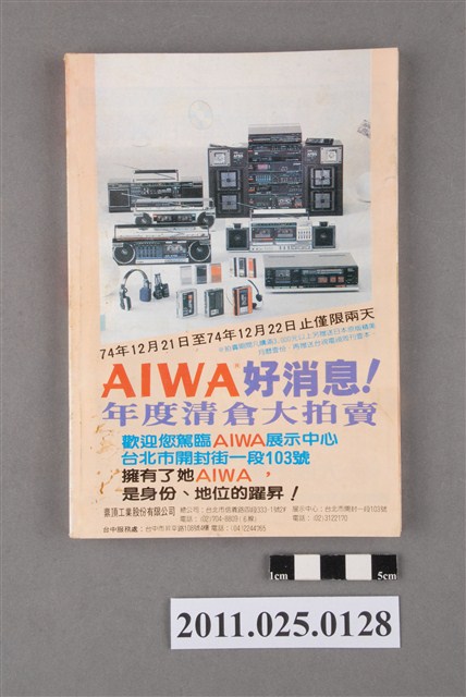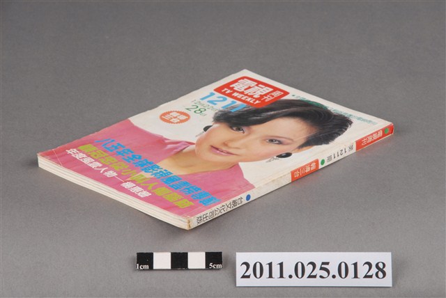 1.本物件為電視周刊TTV WEEKLY第1211期,封面照片為明星方芳芳。由物件正面可見「電視周刊TTV WEEKLY 第1211期」、「12月22日-12月28日」字樣。其目錄章節可見包括「特別報導」(如:八五年影視風雲榜)、「電視論壇」(如:調動方言節目時段宜乎審慎)、「三台節目焦點」(如:中視金獎劇場撥出紅男綠女)、「綜合專欄」(如:看電視談電視 談節目廣告的技巧)、「人物特寫」(如:徐貴櫻走紅銀幕盼演連續劇)、「彩色之頁」(如:楊峻榮要成歌壇新寵)。該周刊內頁亦可見刊物發行所為台視文化事業公司,地址為臺北市八德路三段二號)。