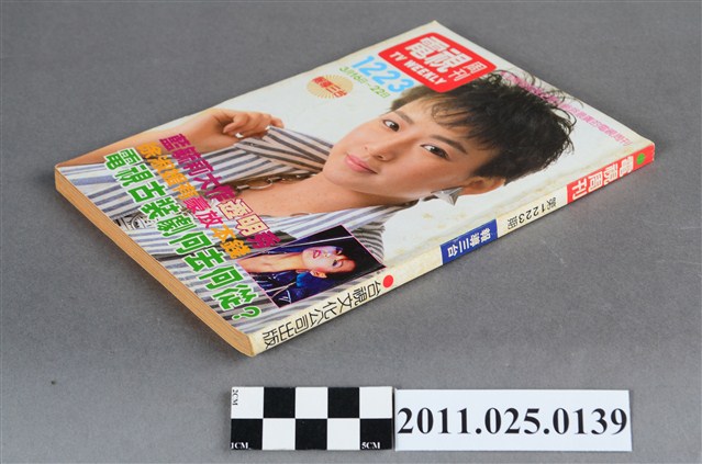 1.本物件為電視周刊TTV WEEKLY第1223期,封面照片為明星許淑蘋。由物件正面可見「電視周刊TTV WEEKLY 第1223期」、「3月16日-3月22日」字樣。其目錄章節可見包括「影視焦點」(如:電視古裝劇何去何從)、「明星熱線」(如:梁朝偉是個沒感情的人)、「節目快報」(如:楊麗花歌仔戲 薛剛又見最佳拍檔)、「綜合專欄」(如:電視論壇)。該周刊內頁亦可見刊物發行所為台視文化事業公司,地址為臺北市八德路三段二號)。
