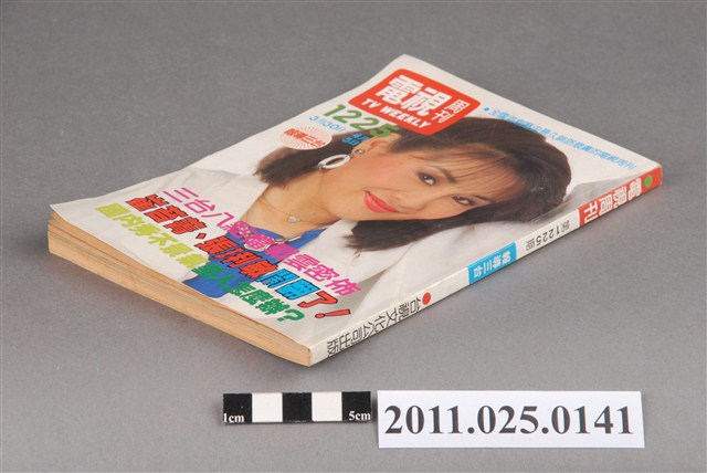 1.本物件為電視周刊TTV WEEKLY第1225期,封面照片為明星魏海敏。由物件正面可見「電視周刊TTV WEEKLY 第1225期」、「3月30日-4月5日」字樣。其目錄章節可見包括「影視焦點」(如:國內秀不景氣藝人怎麼辦)、「明星熱線」(如:魏海敏要扮好每個角色)、「節目快報」(如:台視推出翡翠劇場電燈泡詼諧逗趣)、「綜合專欄」(如:電視論壇)。該周刊內頁亦可見刊物發行所為台視文化事業公司,地址為臺北市八德路三段二號)。