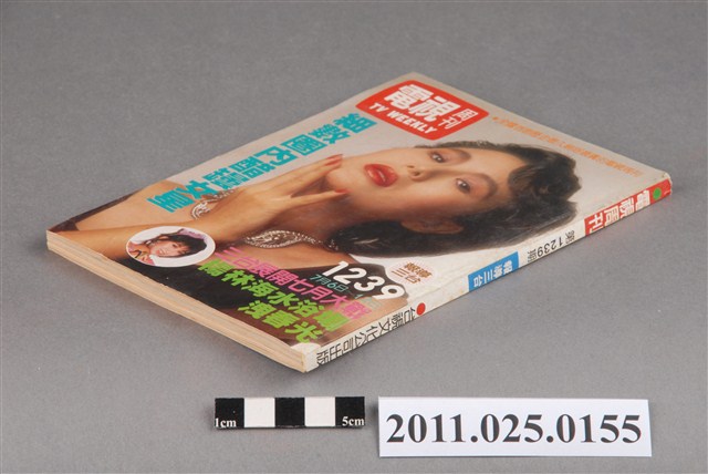 1.本物件為電視周刊TTV WEEKLY第1239期,封面照片為明星徐樂眉。由物件正面可見「電視周刊TTV WEEKLY 第1239期」、「7月6日-7月12日」字樣。其目錄章節可見包括「影視焦點」(如:三台展開七月大戰)、「明星熱線」(如:施思罷演為那般)、「節目快報」(如:楊麗花也得伺候小祖宗)、「綜合專欄」(如:電視論壇)。該周刊內頁亦可見刊物發行所為台視文化事業公司,地址為臺北市八德路三段二號)。