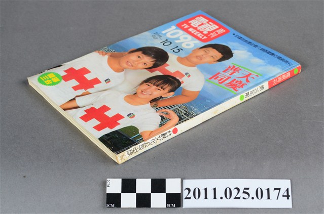 1.本物件為電視周刊TTV WEEKLY第1096期,封面照片為明星羅文成、林彥甫、蔡燦得。由物件正面可見「電視周刊TTV WEEKLY 第1096期」、「10月9日-10月15日」字樣。其目錄章節可見包括「特別報導」(如:三台製播國慶特別節目)、「電視論壇」(如:光輝的十月 創新的契機)、「三台節目焦點」(如:向太陽挑戰 刻劃成功企業家的奮鬪)、「綜合專欄」(如:看電視談電視 期盼星星的故鄉)、「人物專訪」(如:溫拿五虎來台盛大公演)、「彩色之頁」(如:明星周曆 楊麗花)。該周刊內頁亦可見刊物發行所為台視文化事業公司,地址為臺北市八德路三段二號)。