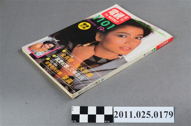 1.本物件為電視周刊TTV WEEKLY第1101期,封面照片為明星鍾楚紅。由物件正面可見「電視周刊TTV WEEKLY 第1101期」、「11月13日-11月19日」字樣。其目錄章節可見包括「特別報導」(如:金馬獎、亞太影展隆重揭幕)、「電視論壇」(如:文化復興節聲中談電視社教與娛樂的功能)、「三台節目焦點」(如:向太陽挑戰 把好戲呈現給觀眾)、「綜合專欄」(如:看電視談電視 請台視製播地方戲曲)、「人物專訪」(如:華萱萱性感賽夢露)、「彩色之頁」(如:明星周曆 夏玲玲)。該周刊內頁亦可見刊物發行所為台視文化事業公司,地址為臺北市八德路三段二號)。