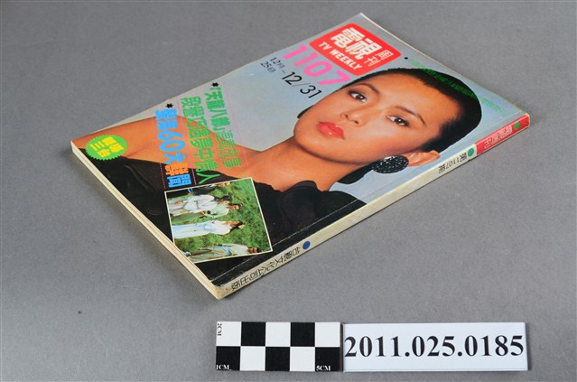 1.本物件為電視周刊TTV WEEKLY第1107期,封面照片為明星陳玉蓮。由物件正面可見「電視周刊TTV WEEKLY 第1107期」、「12月25日-12月31日」字樣。其目錄章節可見包括「特別報導」(如:螢海風雲這一年系列報導)、「電視論壇」(如:滿目新氣象的秋潮向晚天)、「三台節目焦點」(如:三台行憲紀念日特別節目)、「綜合專欄」(如:看電視談電視 感謝熱線你和我助尋恩人)、「人物專訪」(如:關聰在寶島事業情場兩得意)、「彩色之頁」(如:明星周曆 黃杏秀)。該周刊內頁亦可見刊物發行所為台視文化事業公司,地址為臺北市八德路三段二號)。