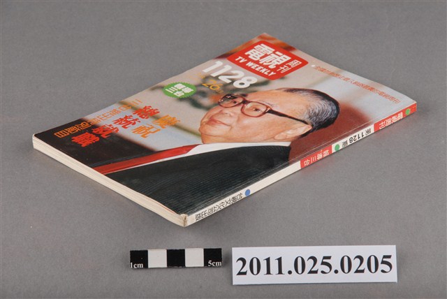1.本物件為電視周刊TTV WEEKLY第1128期,封面照片為蔣經國總統。由物件正面可見「電視周刊TTV WEEKLY 第1128期」、「5月20日-5月26日」字樣。其目錄章節可見包括「特別報導」(如:三台慶祝總統副總統就職特別節目)、「電視論壇」(如:邁向國家的康莊大道 賀第七任總統副總統就職)、「三台節目焦點」(如:翡翠假期明星水上台上大競賽)、「綜合專欄」(如:看電視談電視 台視節目越做越棒)、「人物專訪」(如:印象合唱團給人煥然一新的印象)、「彩色之頁」(如:明星周曆 宋岡陵)。該周刊內頁亦可見刊物發行所為台視文化事業公司,地址為臺北市八德路三段二號)。