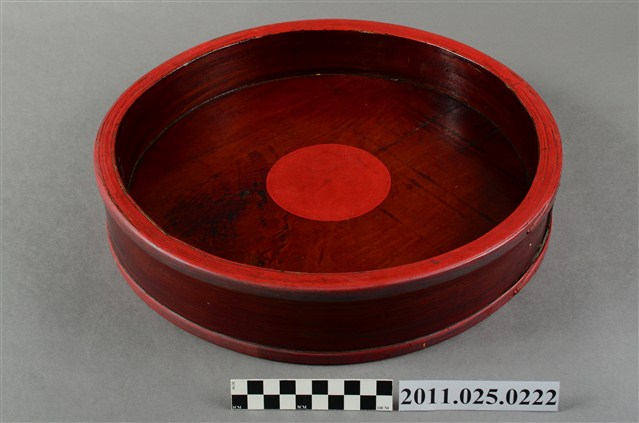 1.此件文物為鄭玉記時期便開始使用的祭祀用果盤。本件圓形盛盤,排底採拼接方式,盤內有一圓形圖漆成紅色作為裝飾。