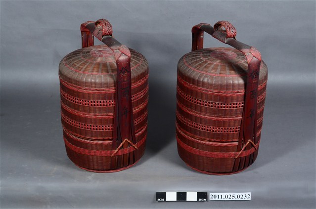 1.此件文物自鄭玉記時期便開始使用。本件屬三層式竹編提籃,周圍就不同編緹方式造成紋路效果並上紅漆作為裝飾。計有一對。