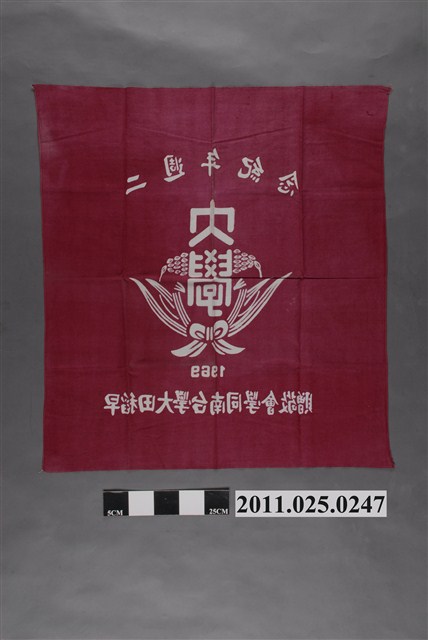 1. 本文物為鄭文忠早稻田大學臺南同學會2週年紀念旗。旗子為紅色,白字,印有二週年紀念、早稻田大學台南同學會敬贈、1968字樣,另有早稻田大學校徽稻穗徽樣。2. 鄭文忠先生(1919-1993)為日本早稻田大學政治經濟系畢。