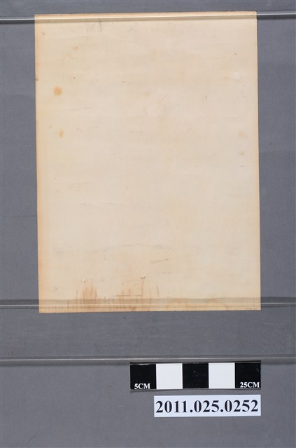本件為鄭玉記之妻鄭陶氏盡半身黑白畫像,頭髮往後梳,表情莊嚴慈祥,兩耳戴珠串耳環,身著黑色冬衣,畫像老舊,右側有一些污漬。