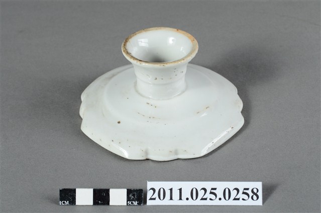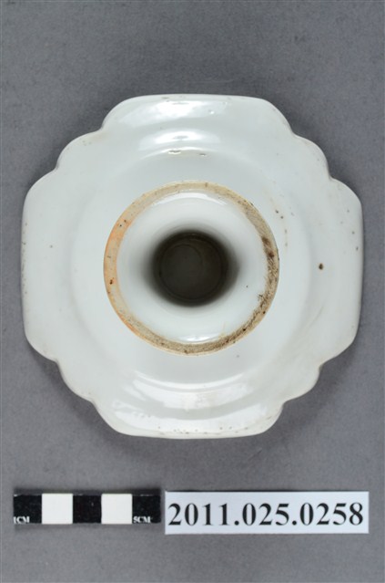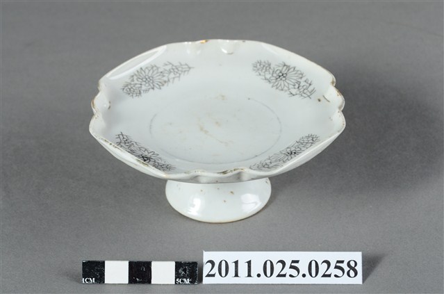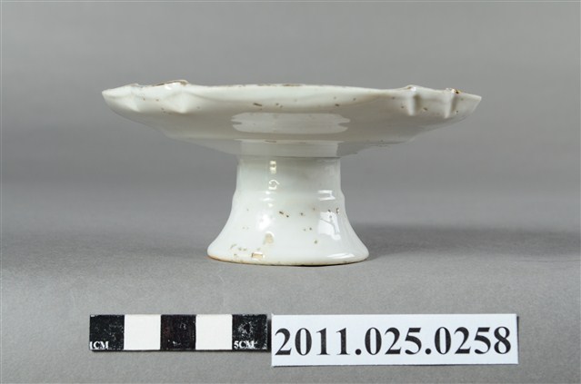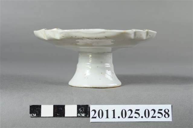 1.本件為高腳圈足瓷盤,盤緣為圓形略作曲線裝飾,盤內有四處花草紋兩兩相對。白瓷。2.此批文物捐贈者鄭林月宮女士(1923—)為臺南鄭家人士。所捐贈文物為自鄭玉記(1872-1944)時期即保存自今的家族文物。鄭玉記為清末、日治時期府城大地主之一,曾於1930年代出資修造臺南開元寺彌勒殿以及昭格堂(鄭氏家廟)。鄭林月宮女士丈夫鄭文忠(1919-1993)先生為鄭玉記嫡孫,曾就讀日本早稻田大學政治經濟系。