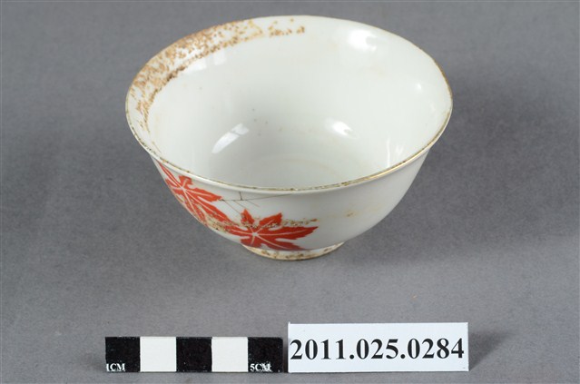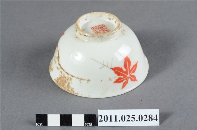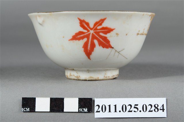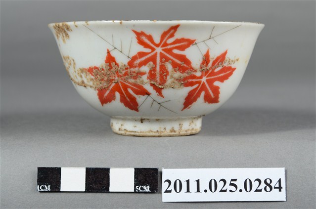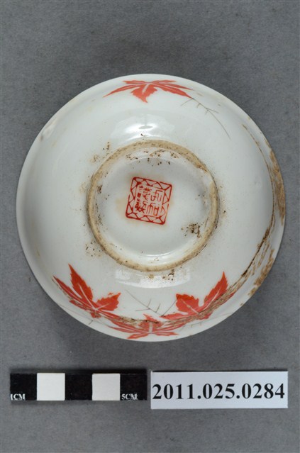 這件紅釉印花楓葉紋碗,屬於日本昭和時代大量產製的日用食具。器形呈侈口,斜直壁,下接圈足,器底稍尖。通體施釉,釉面通透有光澤,口沿與器壁都沾黏窯沙。口沿塗一圈金彩裝飾,但局部剝落。碗壁以印花轉寫方式裝飾紅楓葉紋樣,上並以細筆繪枝幹。碗底圈足內有紅彩款印「丸和謹製」,為名古屋地區產製的產品。