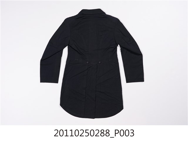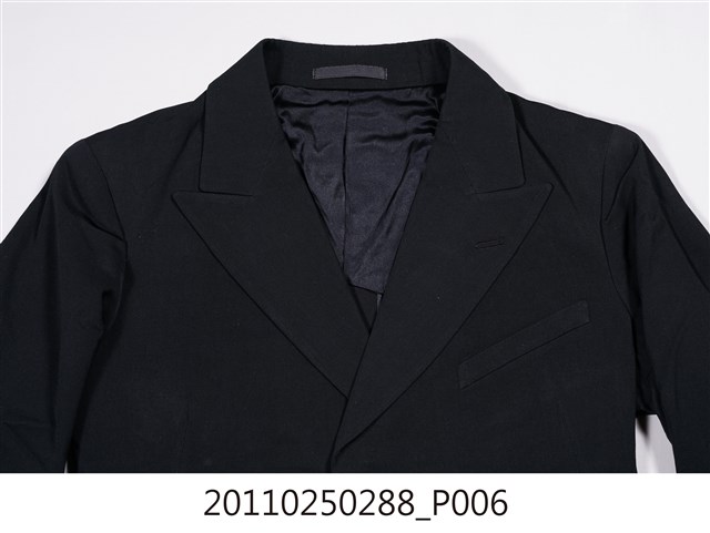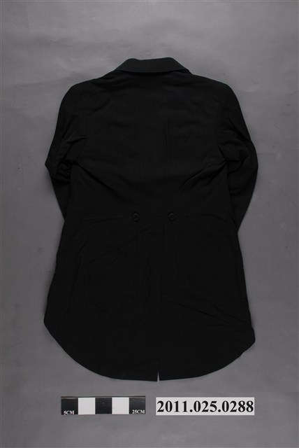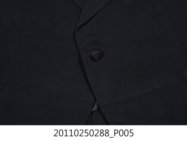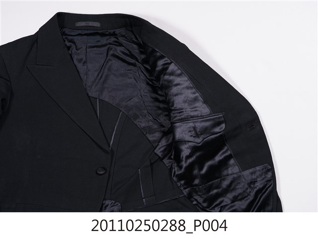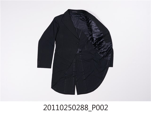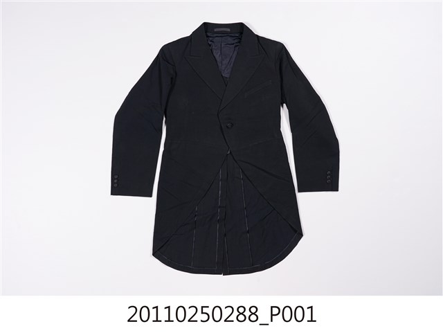 1. 此件服裝為雙層結構,表布為黑色毛料製作,內襯黑色緞面絲裡,衣服後領中心有裡布做成的袢環,用來掛衣服的時候使用。衣服的正面是單片裁剪(無剪接片),前開襟單排扣(縫有一顆包扣),前襟下襬向左右作弧度展開,典型的劍領(尖角領)造型,左邊下片領外側有一橫開的釦眼(此為插花朵的開孔),左胸前有立式口袋。燕尾服的裁剪特色在後片的剪接,為了做出合身的線條,後身有多道接縫線,腰線下以打褶來增加活動量,並在褶子頂端加縫釦子聚焦視覺效果。袖子通常為合身的二片袖,袖口開衩並縫袖釦作裝飾,整體效果隆重而高雅。2. 燕尾服(tailcoat)是一種前身短,裁至腰部,後襬較長(一般到膝下)的外套,因後襬開衩如燕尾而被稱作燕尾服,原本是因應騎馬需求而產生的服裝,後來演變為正式的禮服。燕尾服的下片領通常採用緞面材質製作,領型為劍領(peaked collar,或稱為尖角式西裝領)造型,下身搭配的長褲邊脇線亦車以緞面條飾,搭配襯衫、白背心、白領結、白手套及黑色漆皮皮鞋。