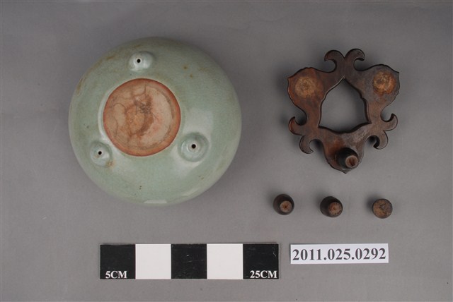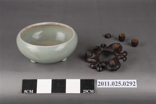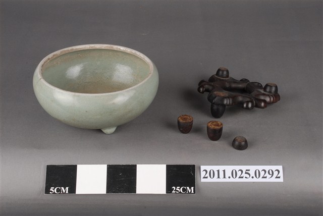 1.本件為青瓷三足香爐,器型特徵為斂口,圓腹,釉色淺青有開片,圓珠式乳形三足,足壁內面有圓形小氣孔,防止燒成時炸裂。香爐下有一木製底座。此件屬於鄭家家中供奉神明祭祀的香爐,鄭玉記時期即使用至今。2.此批文物捐贈者鄭林月宮女士(1923—)為臺南鄭家人士。所捐贈文物為自鄭玉記(1872-1944)時期即保存自今的家族文物。鄭玉記為清末、日治時期府城大地主之一,曾於1930年代出資修造臺南開元寺彌勒殿以及昭格堂(鄭氏家廟)。鄭林月宮女士丈夫鄭文忠(1919-1993)先生為鄭玉記嫡孫,曾就讀日本早稻田大學政治經濟系。