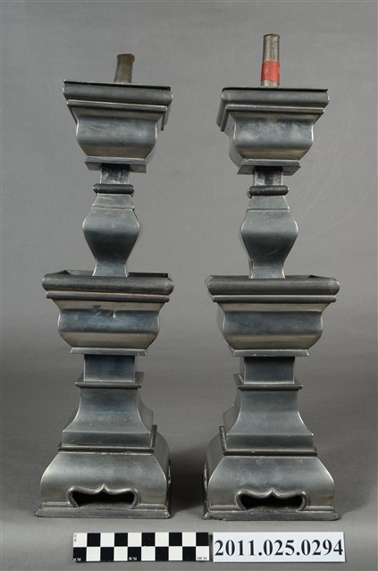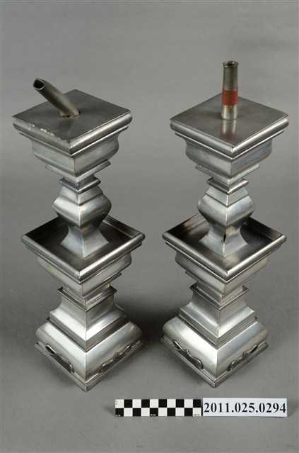 1.本件為錫製燭臺一對,作方體造形,中間壺身,有一件器身稍有傾斜和燭針歪斜,未見紋飾與年款。燭臺是安置蠟燭以祭祀神祇、祖先的禮器。分成祭祀、儀式用具和一般室內用具兩種,前者形體較大,工藝精緻,成對配置,如龍鳳燭臺、壽字燭臺;後者形式樸實,講究實用為主,不拘奇偶數。燭臺材料多見錫、陶、瓷、銅、木等等。2.此批文物捐贈者鄭林月宮女士(1923—)為臺南鄭家人士。所捐贈文物為自鄭玉記(1872-1944)時期即保存自今的家族文物。鄭玉記為清末、日治時期府城大地主之一,曾於1930年代出資修造臺南開元寺彌勒殿以及昭格堂(鄭氏家廟)。鄭林月宮女士丈夫鄭文忠(1919-1993)先生為鄭玉記嫡孫,曾就讀日本早稻田大學政治經濟系。
