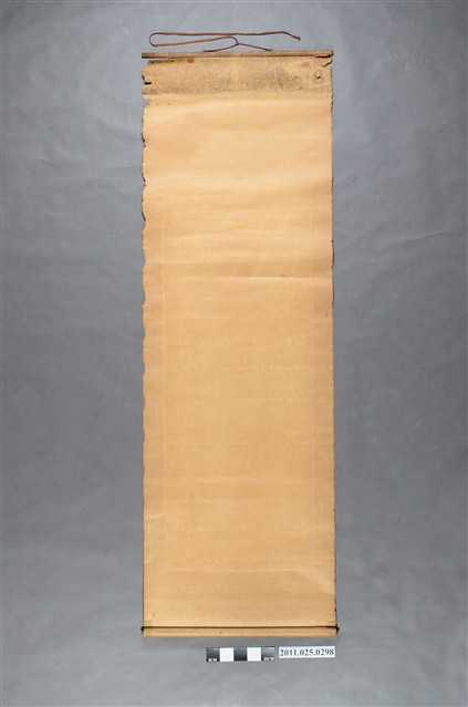 1.本件吳芾繪直式楓林圖掛軸,右上方有「楓林策扙 擬意在雲林」、「秋岳之間 乙亥六月吳芾」等字,下方蓋有方形的「吳芾畫印」。作畫有湖光山色,下方一座小平橋,橋上有一位持拐扙者走過。收捲之後可以看到軸身貼有「吳芾先生 山水」等字的紙條,字下方印有一方印。掛軸老舊,周邊有些許破損,呈現泛黃,尤其是最上方一段收捲之後外露的部份,脆化嚴重。2.1920、30年代不少中國詩書畫家來臺客居,例如李霞、吳芾、吳琨、鄭蘭、曾培勳、楊草仙和區建公等人,當時這些中國畫家的字畫價格潤筆費很高,多半是地方士紳富商才有能力收藏欣賞。吳芾為福建廈門人,是擅長花鳥的水墨畫家。大正6年(1917)應板橋林家之聘來臺客居。