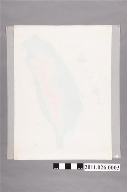 1. 本物件為臺灣地形圖為主題之地圖膠片,其正面為臺灣地形圖之彩色暈渲圖,中間為以淡綠色描繪臺灣島嶼輪廓之地圖,以不同的顏色象徵地形之海拔高度,並可辨識地圖繪製地形包含大屯火山、雪山山脈、大肚台地、八卦台地、中央山脈、阿里山山脈、玉山山脈、花東縱谷及海岸山脈等區域,左方有1山形圖示,其顏色由上至下漸層為咖啡色、橘色、黃色、綠色、淡藍色。背面為空白,隱約可見正面臺灣島之鏡像,及顏色因透至背面轉淡。2. 此圖總編輯吳信政教授為師大地理系退休教授,在地理學界與地圖學界有極高學術地位。彩色暈渲圖是將「高層分層設色圖」及「地形暈渲圖」套疊而成,具有以不同色彩表示地勢高低變化,以及以暈渲法描繪光線與地面傾斜關係的陰影,展現地形陡緩之立體效果的優點。