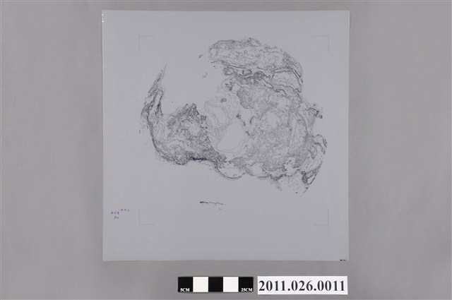 1. 本物件為以北半球水域等高線圖為主題之膠片,其正面為黑白色調線條繪製的北半球水域等高線圖,地圖四角有L字型的圖框,中央繪製有1圓形球體平面,地圖呈現區域應為北極上方投影之北半球地圖,線條密集處所繪製區域分別為北美洲、歐亞大陸、以及非洲北部區域,地圖圖框外右下方,有以紫色字體書寫之文字為「北半球」、「等高線」、「水域」;背面為北半球水域等高線圖之鏡像地圖,地圖四角有L字型圖框,繪製區域由右至左為非洲北部、歐亞大陸、北美洲區域,左下角以紫色字體有「北半球」、「等高線」、「水域」之鏡像文字。2. 此圖總編輯吳信政教授為師大地理系退休教授,具有地圖學、地圖設計、遙測學等專長。