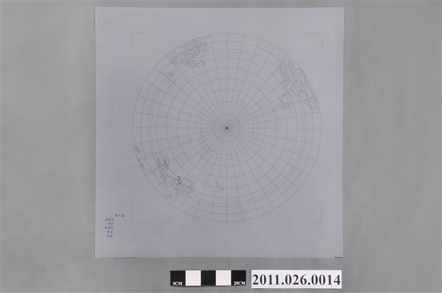 1. 本物件為以南半球水文圖為主題之膠片,其正面為黑白色調線條繪製的南半球水文圖,地圖四角有L字型的圖框,中央繪製有1圓形球體平面,地圖呈現區域應為南極上方投影之南半球地圖,所繪製區域為印度、澳洲、大洋洲、南美洲等陸塊之水文,沒有繪製陸塊輪廓,地圖圖框外右下方,有以紫色字體書寫之文字為「南半球:」、「經緯線」、「河流」、「間歇湖」、「塩湖」、「暗礁」;背面為南半球水文圖之鏡像地圖,地圖四角有L字型圖框,繪製區域由右至左為南美洲、南極洲、印度南部、澳洲及大洋洲,沒有陸塊輪廓之繪製,僅繪製區域水文圖,左下角以紫色字體有「南半球:」、「經緯線」、「河流」、「間歇湖」、「塩湖」、「暗礁」之鏡像文字。2. 此圖總編輯吳信政教授為師大地理系退休教授,具有地圖學、地圖設計、遙測學等專長。