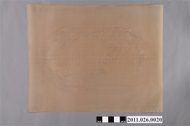 1. 本物件為以世界水文圖為主題之地圖膠片,其正面為世界水文圖之地圖,右方區塊為北美洲及南美洲陸塊,繪製水文線由上至下包含哥倫比亞河、密蘇里河、密西西比河、格蘭德河、亞馬遜河流域,並標有「墨西哥灣」、「加勒比海」;地圖中央陸塊為澳洲、大洋洲,繪製水文線有墨累河、達令河,並標有「珊瑚海」、「塔本塔利灣」、「帝汶海」、「大澳洲灣」;中間偏左為歐亞大陸陸塊之輪廓,繪製水文線有勒拿河、葉尼塞河、黑龍江、黃河、長江、雅魯藏布江、珠江、湄公河、恆河、印度河、幼發拉底河、底格里斯河、第聶伯河、易北河、多瑙河,並標有「鄂霍次克海」、「日本海」、「黃海」、「東海」、「南中國灣」、「孟加拉灣」、「阿拉伯灣」、「印度洋」、「紅海」、「黑海」、「北海」、「地中海」;左側為非洲陸塊之輪廓,繪製水文線有尼羅河、尼日河、剛果河、尚比西河、奧蘭治河,並標有「幾內亞灣」、「大西洋」;底側為南極大陸之陸塊輪廓。膠片背面為世界水文圖地圖之鏡像,由右至左為非洲、歐亞大陸、澳洲、大洋洲、南極洲、北美洲、南美洲陸塊輪廓之鏡像。2.此圖總編輯吳信政教授為師大地理系退休教授,具有地圖學、地圖設計、遙測學等專長;橫麥卡托投影法由佛蘭德的地圖學家Gerardus Mercator發明,為圓筒投影,將圓筒相切於赤道位置進行正形投影,具有緯線在地圖上為直線,便於航海之優點,但對於高緯度地區則會因正形投影而間格變大,地區變形的缺點。
