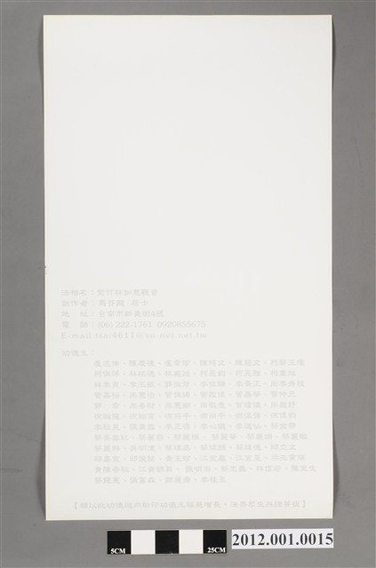 本件為馬芥龍繪紫竹林如意觀音畫像,觀音半跏坐於岩石,右腳垂下踩蓮花,左手持如意。前有善財拜觀音,後有龍女捧淨瓶,上方有白鸚鵡啣念珠。畫像右下角落款「歲次丙戌年瓜月馬芥龍敬繪」並蓋印,丙戌年為2006年。。背面註明法相名、創作者、地址、E-mail、功德主。