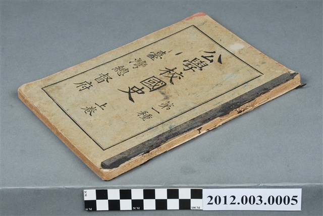 1. 本文物為《公學校國史卷上第一種》。封面印有公學校國史、上卷、第一種、臺灣總督府字樣。封底有手寫之五ノ五 柯英傑字樣。目錄總共分成28項標題,例有天照大神、神功皇后、弘法大師、平清盛、源賴朝、足利義滿、戰國時代等,另有年表。本書由臺灣總督府,於昭和10年(1935)2月10日第13版發行。2. 日本時代歷史教育係以涵養國民精神為目的,研究者蔡蕙光指出,公學校歷史教育是日本「國體」原則下的產物,歷史教科書以日本歷史上之人物與事蹟來說明「國體」的意涵;「國體」觀念即是萬世一系天皇統治,臣民忠誠之皇國史觀的觀念,歷史教科書中的人物與事蹟為此一觀念的例證。因此其內容,包括天照大神,各代符合國體概念的天皇與忠臣之事蹟。