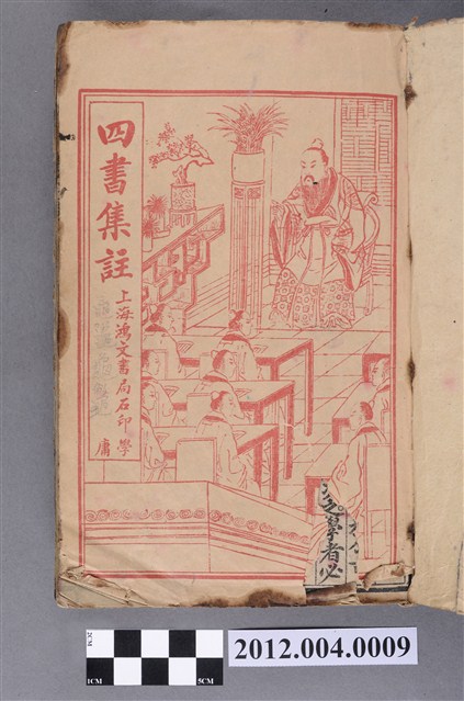本文物為朱熹著《四書集註》。線裝書,封面無字無圖,此封面應為另外加上,翻開才為真正封面。真正封面印有四書集註、上海鴻文書局石印字樣。無目錄頁,內容為大學、中庸、論語﹝上下﹞、孟子﹝上中下﹞註。本書由上海鴻文書局印。