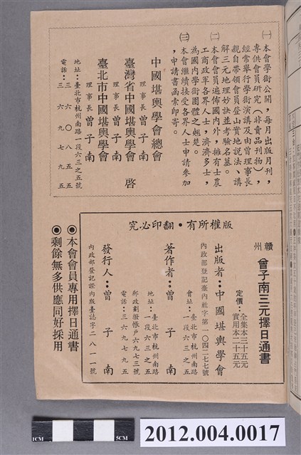 風水觀念由來已久,觀念深入民間社會,所以各類風水數術書籍廣為流傳,又有不同派別及師承。本件《贛州曾子南三元擇日通書便覽》第一版,民國61年由中國堪輿學會出版,封面特別註明「千年秘密 今天公開」、「天文台審查時刻準確」、「附三合供參考」等字樣。從書名而言,應屬三元派派別。曾子南身兼中國堪輿學會、臺灣省中國堪輿學會、臺北市中國堪輿學會之理事長。