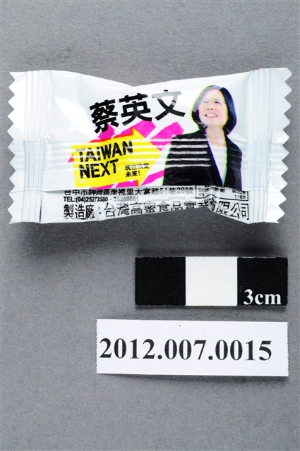 此為一糖果,糖果外包裝紙以白色為底,右方印有蔡英文的照片,中間以黑色字體印有「蔡英文」,下方以黃色箭頭為底印有「TAIWAN NEXT現在決定未來!」。 此物件為2012年的第13任總統副總統選舉民主進步黨候選人的相關競選物件,此次選舉由代表中國國民黨的馬英九、吳敦義;代表民主進步黨的蔡英文、蘇嘉全;代表親民黨的宋楚瑜、林瑞雄參與選舉。代表民進黨的蔡英文與同為民進黨籍的蘇貞昌經過黨內競爭後脫穎而出,並且在選舉中以「經濟」、「農業」、「兩岸」等議題以爭取選票,並以「TAIWAN NEXT」、「臺灣第一女總統」為競選口號。最終,代表國民黨的馬英九、吳敦義組合當選,馬英九成功連任第13任總統。