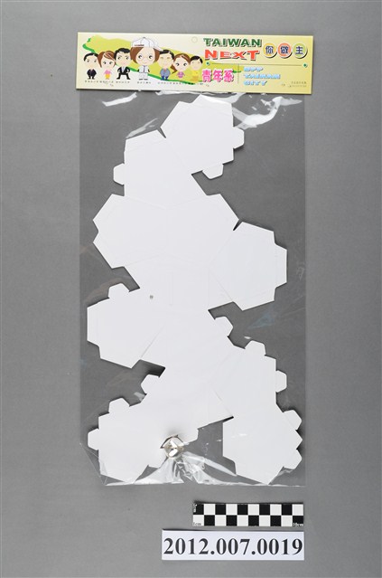 此為一紙質印刷品,為紙球展開圖,共十二面,以白色為底,以彩色印刷,內容為中華民國第13任民主進步黨總統候選人蔡英文與第8屆立法委員選舉臺南市選區民主進步黨立法委員候選人的Q版人像。 此物件為2012年的第13任總統副總統選舉民主進步黨候選人的相關競選物件,此次選舉由代表中國國民黨的馬英九、吳敦義;代表民主進步黨的蔡英文、蘇嘉全;代表親民黨的宋楚瑜、林瑞雄參與選舉。代表民進黨的蔡英文與同為民進黨籍的蘇貞昌經過黨內競爭後脫穎而出,並且在選舉中以「經濟」、「農業」、「兩岸」等議題以爭取選票,並以「TAIWAN NEXT」、「臺灣第一女總統」為競選口號。最終,代表國民黨的馬英九、吳敦義組合當選,馬英九成功連任第13任總統。