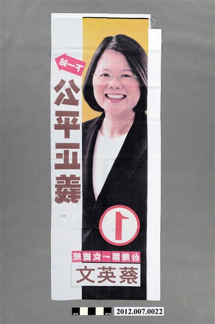 此為一旗幟,以白色為底,為彩色印刷,印有蔡英文的照片,右方印有「下一站 公平正義」,下方印有「➀臺灣第一女總統蔡英文」。 此物件為2012年的第13任總統副總統選舉民主進步黨候選人的相關競選物件,此次選舉由代表中國國民黨的馬英九、吳敦義;代表民主進步黨的蔡英文、蘇嘉全;代表親民黨的宋楚瑜、林瑞雄參與選舉。代表民進黨的蔡英文與同為民進黨籍的蘇貞昌經過黨內競爭後脫穎而出,並且在選舉中以「經濟」、「農業」、「兩岸」等議題以爭取選票,並以「TAIWAN NEXT」、「臺灣第一女總統」為競選口號。最終,代表國民黨的馬英九、吳敦義組合當選,馬英九成功連任第13任總統。