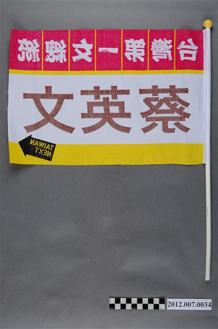 此為一旗幟,以白色為底,上、下方以黃色繞邊,上方以紅色方格為底印有「臺灣第一女總統」,中間以咖啡色字體印有「蔡英文」,右下角以黑色箭頭為底印有「TAIWAN NEXT」。 此物件為2012年的第13任總統副總統選舉民主進步黨候選人的相關競選物件,此次選舉由代表中國國民黨的馬英九、吳敦義;代表民主進步黨的蔡英文、蘇嘉全;代表親民黨的宋楚瑜、林瑞雄參與選舉。代表民進黨的蔡英文與同為民進黨籍的蘇貞昌經過黨內競爭後脫穎而出,並且在選舉中以「經濟」、「農業」、「兩岸」等議題以爭取選票,並以「TAIWAN NEXT」、「臺灣第一女總統」為競選口號。最終,代表國民黨的馬英九、吳敦義組合當選,馬英九成功連任第13任總統。