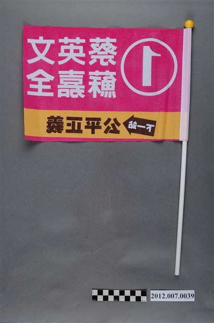 此為一旗幟,以紅色為底,以白色字體印有「➀蔡英文 蘇嘉全」,下方以黃色為底印有以黑色箭頭為底的「下一站」並以黑色字體印有「公平正義」。 此物件為2012年的第13任總統副總統選舉民主進步黨候選人的相關競選物件,此次選舉由代表中國國民黨的馬英九、吳敦義;代表民主進步黨的蔡英文、蘇嘉全;代表親民黨的宋楚瑜、林瑞雄參與選舉。代表民進黨的蔡英文與同為民進黨籍的蘇貞昌經過黨內競爭後脫穎而出,並且在選舉中以「經濟」、「農業」、「兩岸」等議題以爭取選票,並以「TAIWAN NEXT」、「臺灣第一女總統」為競選口號。最終,代表國民黨的馬英九、吳敦義組合當選,馬英九成功連任第13任總統。