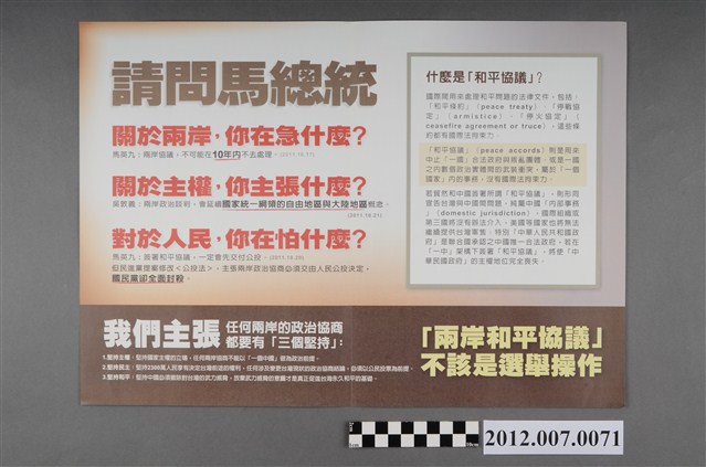 此為一紙質印刷品,為彩色、雙面印刷,正面右方為手持麥克風的蔡英文的照片,左方以文字說明蔡英文主張,下方以咖啡色為底印有募款相關信息,反面以灰色為底咖啡色為邊,左方為對時任總統的馬英九的提問,右方為「和平協議」的說明,下方以咖啡色為底印有民主進步黨的主張。 此物件為2012年的第13任總統副總統選舉民主進步黨候選人的相關競選物件,此次選舉由代表中國國民黨的馬英九、吳敦義;代表民主進步黨的蔡英文、蘇嘉全;代表親民黨的宋楚瑜、林瑞雄參與選舉。代表民進黨的蔡英文與同為民進黨籍的蘇貞昌經過黨內競爭後脫穎而出,並且在選舉中以「經濟」、「農業」、「兩岸」等議題以爭取選票,並以「TAIWAN NEXT」、「臺灣第一女總統」為競選口號。最終,代表國民黨的馬英九、吳敦義組合當選,馬英九成功連任第13任總統。