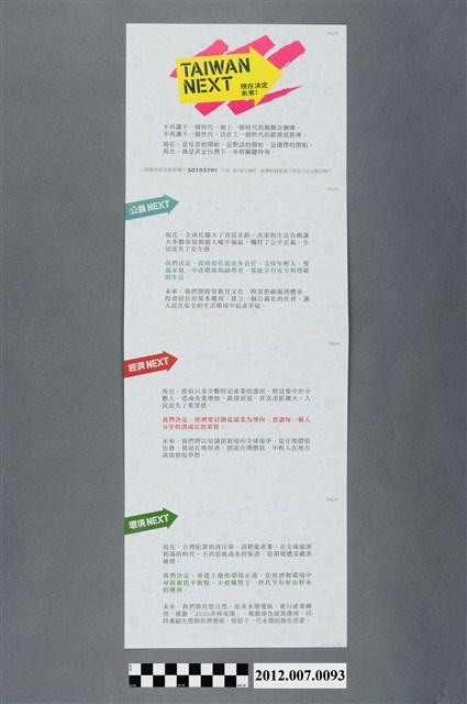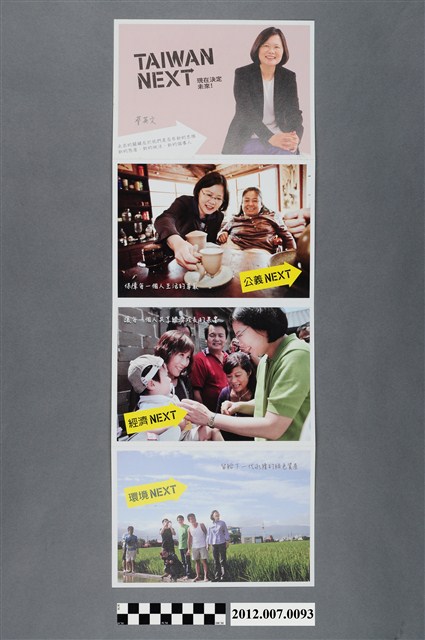 此物件為雙面印刷,三折後使用,是中華民國第13任民主進步黨正副總統候選人蔡英文與蘇嘉全的競選文宣。