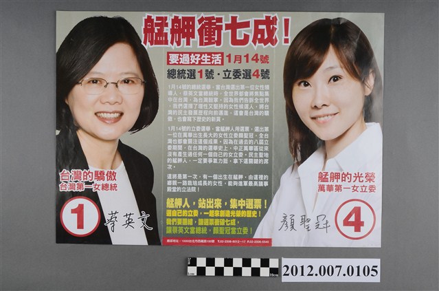 此為一紙質印刷品,為彩色印刷,雙面印刷,二折後使用,外頁左右兩側分別為蔡英文、顏聖冠的照片,為中華民國第8屆立法委員選舉,台北市第五選區(萬華區、中正區21里)民主進步黨立法委員候選人顏聖冠的競選文宣。 本物件的主要人物為顏聖冠,嘉義人。顏聖冠曾擔任第8至12屆的臺北市議員,父親為民主進步黨的前立法委員顏錦福,曾在2002年於議員任內赴美留學引發輿論,險些遭民進黨團除名。在本物件提及的2012年立法委員選舉中,敗給中國國民黨派出的林郁方而未能當選。 臺灣的立法委員選舉始於1948年,尚領有部分中國領土的中華民國政府以全國各省、直轄市,以及邊疆民族、僑民、職業團體為範疇舉行選舉。1949年中央政府遷臺,自中國大陸各省隨附來臺的立法委員,依「司法院大法官會議釋字第31號解釋」得以國家發展、社會安定之需要而無限期延任。1969年,中華民國政府發佈《動員戡亂時期自由地區中央公職人員增選補選辦法》展開立法委員的增補選,此後每屆選舉之競爭益加激烈,甚至於1977年爆發「中壢事件」。最後,經歷1991年的憲法增修,政府得以正式展開「中央民意代表全面改選」,並於1992年舉辦了第二屆立法委員選舉。