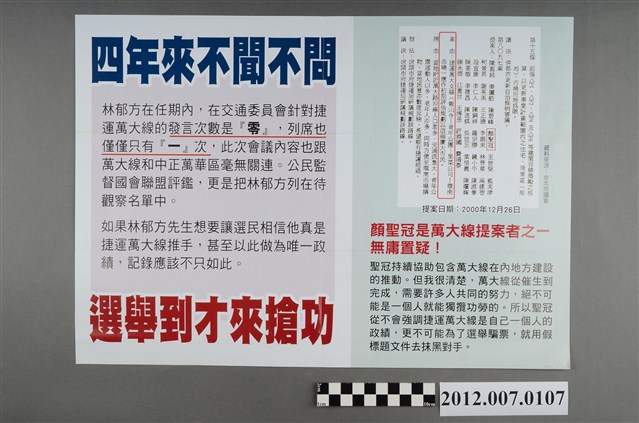 此為一紙質印刷品,為彩色印刷,雙面印刷,標題為〈別讓抹黑決定我們的未來!我們要乾淨、正面的選舉〉內容為顏聖冠提出林郁方委員的反對,此為中華民國第8屆立法委員選舉,台北市第五選區(萬華區、中正區21里)民主進步黨立法委員候選人顏聖冠的競選文宣。 本物件的主要人物為顏聖冠,嘉義人。顏聖冠曾擔任第8至12屆的臺北市議員,父親為民主進步黨的前立法委員顏錦福,曾在2002年於議員任內赴美留學引發輿論,險些遭民進黨團除名。在本物件提及的2012年立法委員選舉中,敗給中國國民黨派出的林郁方而未能當選。 臺灣的立法委員選舉始於1948年,尚領有部分中國領土的中華民國政府以全國各省、直轄市,以及邊疆民族、僑民、職業團體為範疇舉行選舉。1949年中央政府遷臺,自中國大陸各省隨附來臺的立法委員,依「司法院大法官會議釋字第31號解釋」得以國家發展、社會安定之需要而無限期延任。1969年,中華民國政府發佈《動員戡亂時期自由地區中央公職人員增選補選辦法》展開立法委員的增補選,此後每屆選舉之競爭益加激烈,甚至於1977年爆發「中壢事件」。最後,經歷1991年的憲法增修,政府得以正式展開「中央民意代表全面改選」,並於1992年舉辦了第二屆立法委員選舉。
