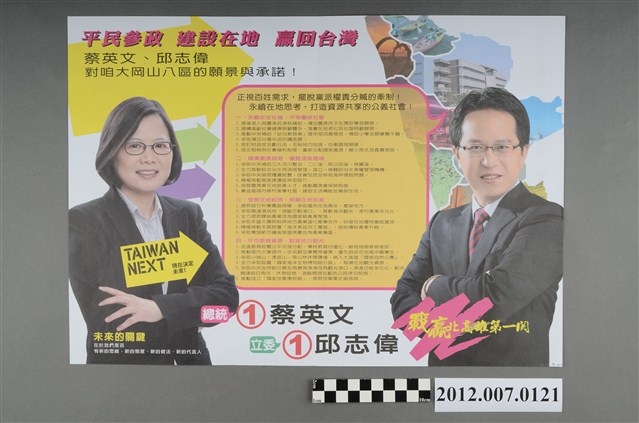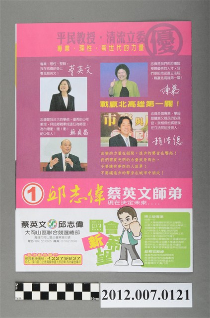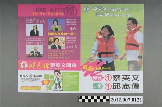 此為一紙質印刷品,為彩色印刷,雙面印刷,對折後使用,標題為〈蔡英文領航面向世界!邱志偉捍衛公平正義!〉,此為中華民國第8屆立法委員選舉,苗栗縣第二選區(頭份鎮、三灣鄉、南庄鄉、頭屋鄉、獅潭鄉、公館鄉、大湖鄉、泰安鄉、卓蘭鎮、苗栗市)民主進步黨立法委員候選人楊長鎮的競選文宣。 此物件提到的邱志偉,為民主進步黨籍的政治人物,為屏東縣麟洛鄉人,曾擔任高雄縣民政處長、高雄市民政局長。後在本物件提及的2012年第8屆立法委員選舉中,民進黨派出邱志偉參選高雄市第2選區的區域立委,最終擊敗代表中國國民黨的林益世,後曾連任第9、10屆立法委員。 臺灣的立法委員選舉始於1948年,尚領有部分中國領土的中華民國政府以全國各省、直轄市,以及邊疆民族、僑民、職業團體為範疇舉行選舉。1949年中央政府遷臺,自中國大陸各省隨附來臺的立法委員,依「司法院大法官會議釋字第31號解釋」得以國家發展、社會安定之需要而無限期延任。1969年,中華民國政府發佈《動員戡亂時期自由地區中央公職人員增選補選辦法》展開立法委員的增補選,此後每屆選舉之競爭益加激烈,甚至於1977年爆發「中壢事件」。最後,經歷1991年的憲法增修,政府得以正式展開「中央民意代表全面改選」,並於1992年舉辦了第二屆立法委員選舉。