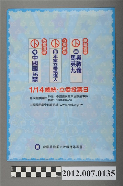 此為一塑膠製資料夾,為彩色印刷,正面標題為〈中華民國第13任正副總統候選人〉,中間為中國國民黨提名之正副總統候選人馬英九與吳敦義之畫像,並寫有「幸福台灣‧黃金未來」的字樣,反面為選票範例圖以及選舉相關資訊,另有國民黨的相關資訊並署名此物件由「中國國民黨文化傳播委員會」出版。 此物件為2012年第13任總統副總統選舉時中國國民黨候選人的相關宣傳品,此次選舉由代表中國國民黨的馬英九、吳敦義;代表民主進步黨的蔡英文、蘇嘉全;代表親民黨的宋楚瑜、林瑞雄參與選舉。代表國民黨的馬英九在競選中開設「臺灣加油讚」競選辦公室,並且以「不統不獨」的「兩岸」政策爭取選民選票。最終,代表國民黨的馬英九、吳敦義組合當選,馬英九成功連任第13任總統。