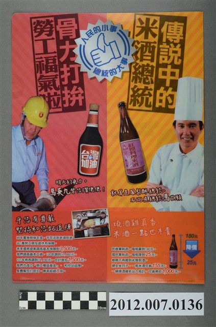 此為一塑膠製資料夾,為彩色印刷,其中一面分為左右兩邊,上方印有「人民的小事 總統的大事」的圖章字樣,右方文宣標題為〈免費裝假牙,健康有笑容〉、左方文宣標題為〈老農津貼7000元〉,並各自刊有候選人馬英九的照片。另一面也分左右兩邊,右方文宣標題為〈傳說中的米酒總統〉、左方文宣標題為〈骨力打拚,勞工福氣啦〉,並各自也刊有總統候選人馬英九的照片。 此物件為2012年第13任總統副總統選舉時中國國民黨候選人的相關宣傳品,此次選舉由代表中國國民黨的馬英九、吳敦義;代表民主進步黨的蔡英文、蘇嘉全;代表親民黨的宋楚瑜、林瑞雄參與選舉。代表國民黨的馬英九在競選中開設「臺灣加油讚」競選辦公室,並且以「不統不獨」的「兩岸」政策爭取選民選票。最終,代表國民黨的馬英九、吳敦義組合當選,馬英九成功連任第13任總統。