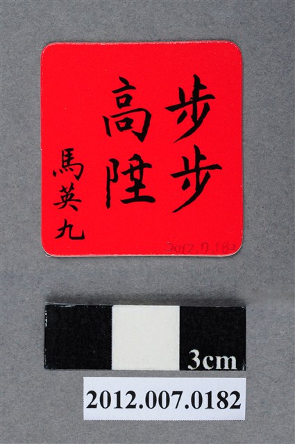 此為一紙質福卡,此福卡共12款,以紅色為底,正面印有國旗及「陞」字,後面為「步步高陞」,並由中國國民黨第13任總統候選人馬英九署名。 此物件為2012年第13任總統副總統選舉時中國國民黨候選人的相關宣傳品,此次選舉由代表中國國民黨的馬英九、吳敦義;代表民主進步黨的蔡英文、蘇嘉全;代表親民黨的宋楚瑜、林瑞雄參與選舉。代表國民黨的馬英九在競選中開設「臺灣加油讚」競選辦公室,並且以「不統不獨」的「兩岸」政策爭取選民選票。最終,代表國民黨的馬英九、吳敦義組合當選,馬英九成功連任第13任總統。