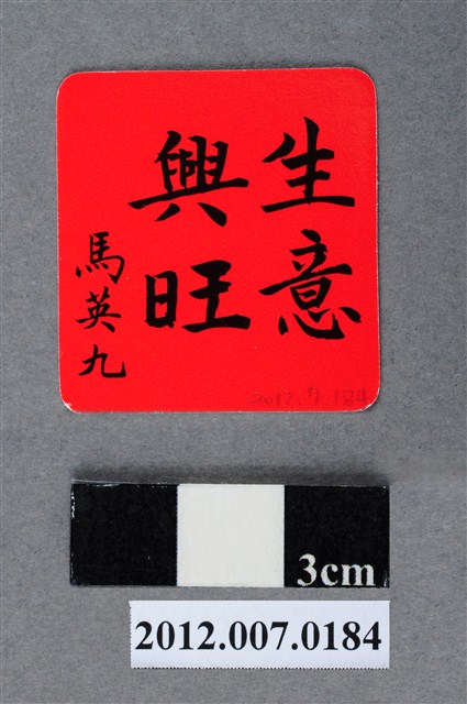 此為一紙質福卡,此福卡共12款,以紅色為底,正面印有國旗及「旺」字,後面為「生意興旺」,並由中國國民黨第13任總統候選人馬英九署名。 此物件為2012年第13任總統副總統選舉時中國國民黨候選人的相關宣傳品,此次選舉由代表中國國民黨的馬英九、吳敦義;代表民主進步黨的蔡英文、蘇嘉全;代表親民黨的宋楚瑜、林瑞雄參與選舉。代表國民黨的馬英九在競選中開設「臺灣加油讚」競選辦公室,並且以「不統不獨」的「兩岸」政策爭取選民選票。最終,代表國民黨的馬英九、吳敦義組合當選,馬英九成功連任第13任總統。