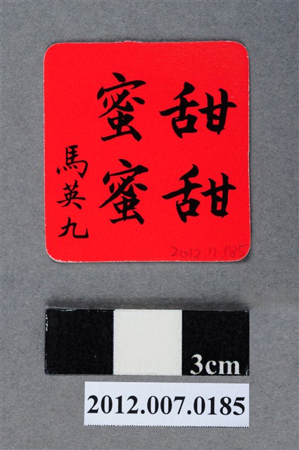 此為一紙質福卡,此福卡共12款,以紅色為底,正面印有國旗及「甜」字,後面為「甜甜蜜蜜」,並由中國國民黨第13任總統候選人馬英九署名。 此物件為2012年第13任總統副總統選舉時中國國民黨候選人的相關宣傳品,此次選舉由代表中國國民黨的馬英九、吳敦義;代表民主進步黨的蔡英文、蘇嘉全;代表親民黨的宋楚瑜、林瑞雄參與選舉。代表國民黨的馬英九在競選中開設「臺灣加油讚」競選辦公室,並且以「不統不獨」的「兩岸」政策爭取選民選票。最終,代表國民黨的馬英九、吳敦義組合當選,馬英九成功連任第13任總統。