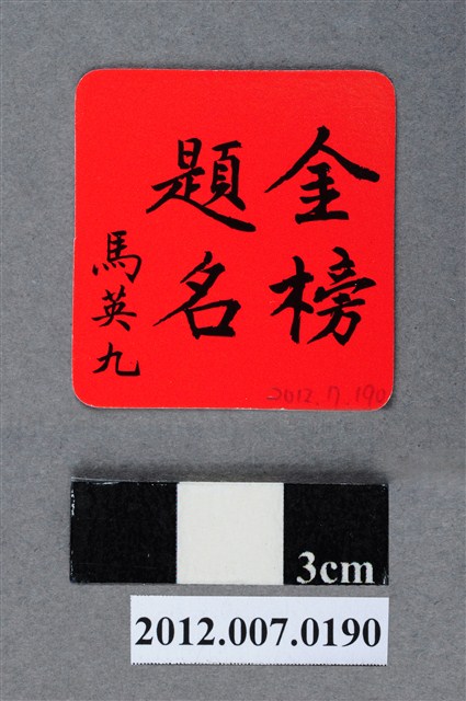 此為一紙質福卡,此福卡共12款,以紅色為底,正面印有國旗及「名」字,後面為「金榜題名」,並由中國國民黨第13任總統候選人馬英九署名。 此物件為2012年第13任總統副總統選舉時中國國民黨候選人的相關宣傳品,此次選舉由代表中國國民黨的馬英九、吳敦義;代表民主進步黨的蔡英文、蘇嘉全;代表親民黨的宋楚瑜、林瑞雄參與選舉。代表國民黨的馬英九在競選中開設「臺灣加油讚」競選辦公室,並且以「不統不獨」的「兩岸」政策爭取選民選票。最終,代表國民黨的馬英九、吳敦義組合當選,馬英九成功連任第13任總統。