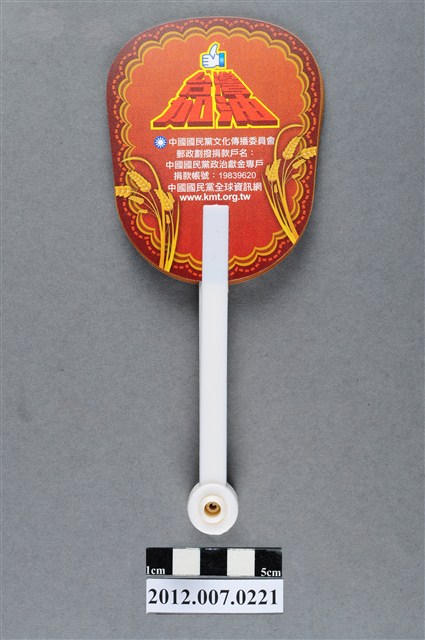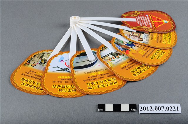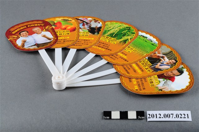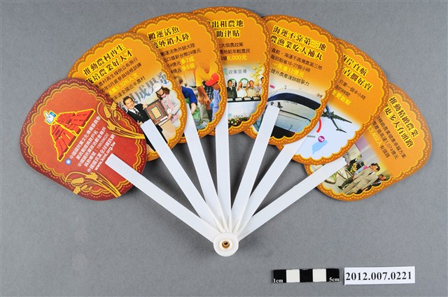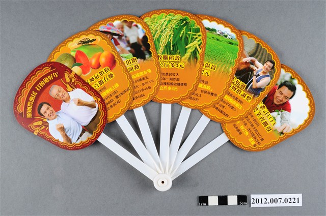 此為一摺扇,共七面,為彩色印刷,首扇、底扇以咖啡色為底,首扇標題為〈照顧農漁民,打拚過好年〉,中間為馬英九、吳敦義的照片,底扇標題為印有馬英九、吳敦義競選辦公室的「臺灣加油讚」形象Logo,另有中國國民黨文化傳播委員會資訊,中間扇面以黃色為底,每一扇面有不同主題的政見與政績。 此物件為2012年第13任總統副總統選舉時中國國民黨候選人的相關宣傳品,此次選舉由代表中國國民黨的馬英九、吳敦義;代表民主進步黨的蔡英文、蘇嘉全;代表親民黨的宋楚瑜、林瑞雄參與選舉。代表國民黨的馬英九在競選中開設「臺灣加油讚」競選辦公室,並且以「不統不獨」的「兩岸」政策爭取選民選票。最終,代表國民黨的馬英九、吳敦義組合當選,馬英九成功連任第13任總統。